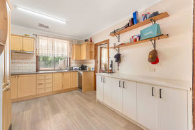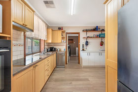 The layout consists of a lounge/dining area flowing into the large kitchen space featuring plenty of working bench space, overhead and underbench cabinetry with appliances including cooktop, rangehood and wall oven.